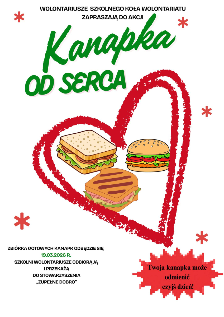 19 marca 2026 r. wolontariusze ze Szkolnego Koła Wolontariatu przeprowadzili akcję „Kanapka od serca” dla Stowarzyszenia #ZupełneDobro z Rzeszowa.