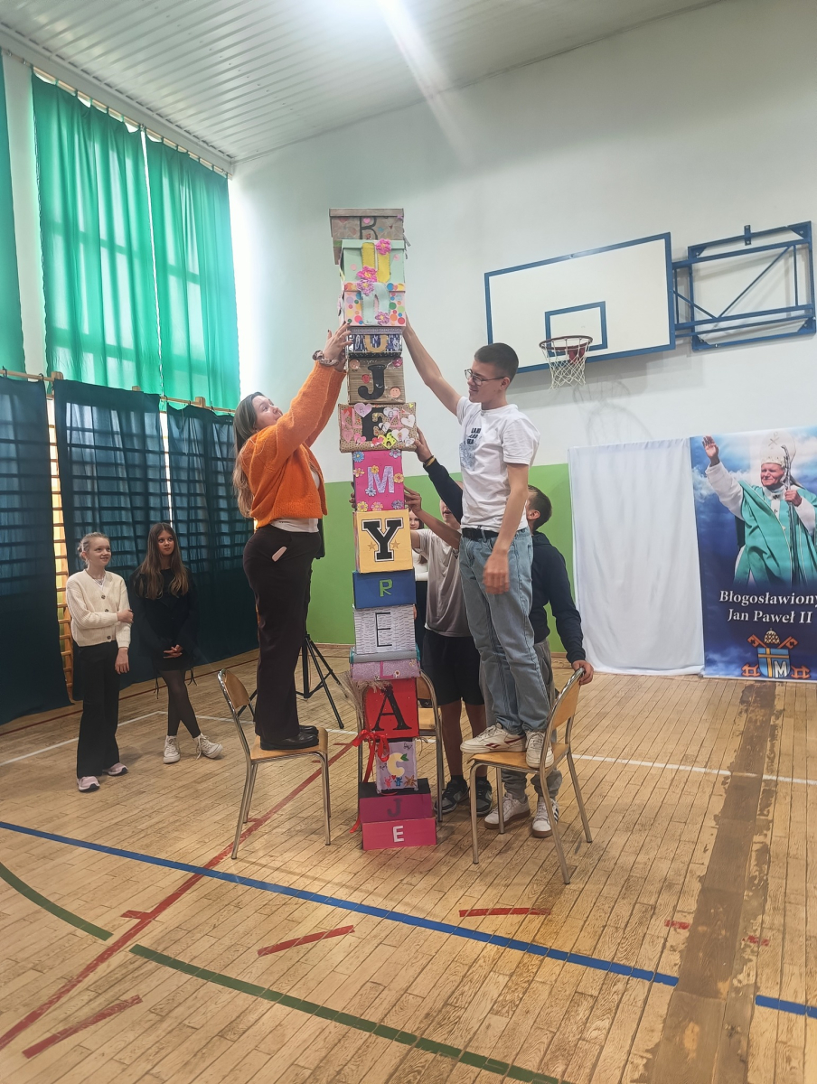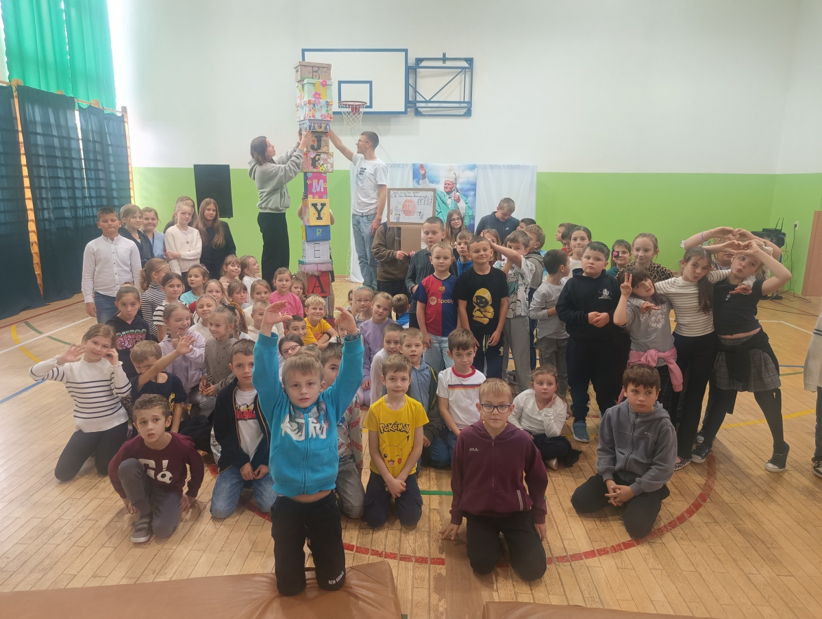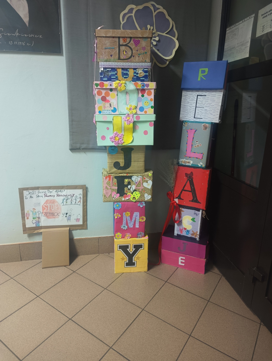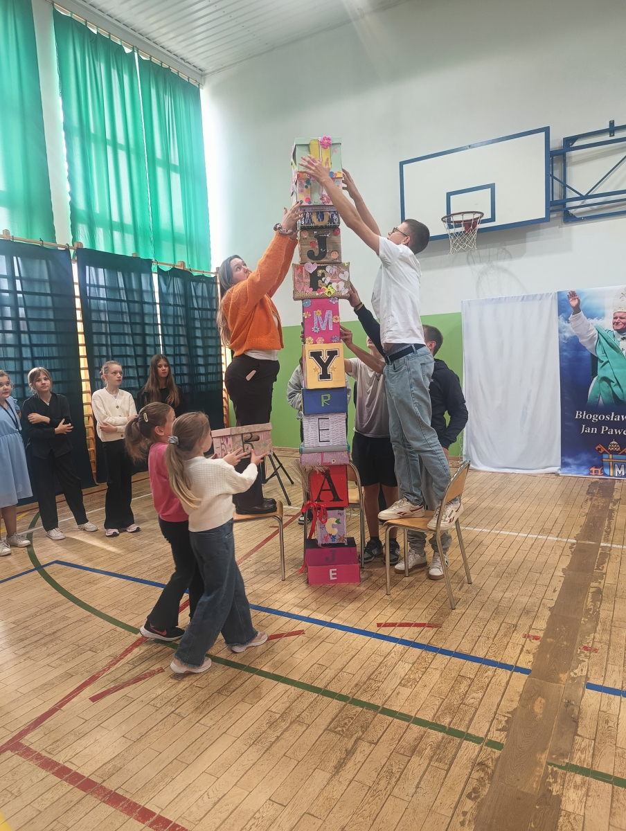 Każda klasa przygotowała i ozdobiła swoje pudełka z literami, które zostały zaprezentowane 16 października 2025r. na sali gimnastycznej. Następnie wspólnie stworzyliśmy Wieżę Relacji – symbol empatii, szacunku i współpracy.