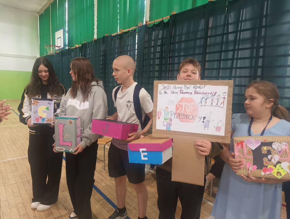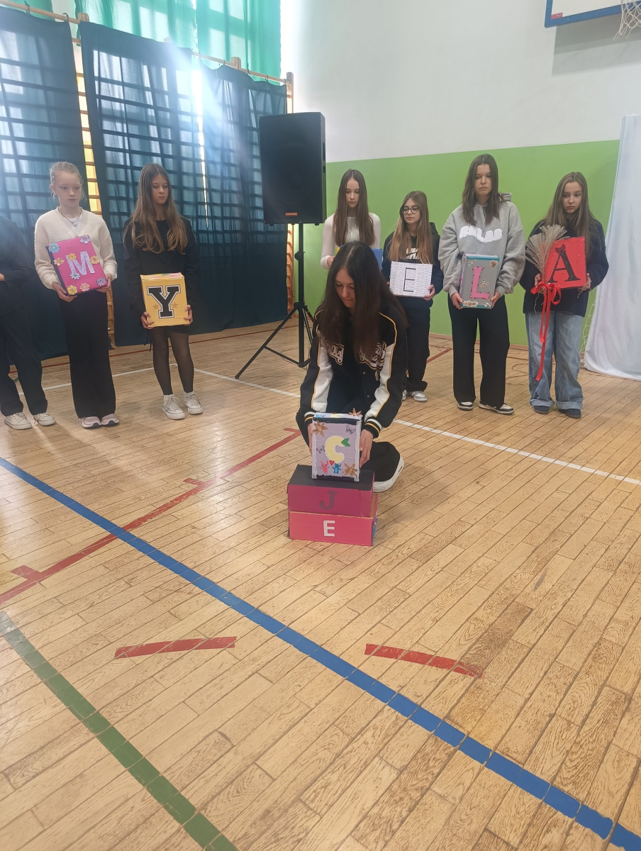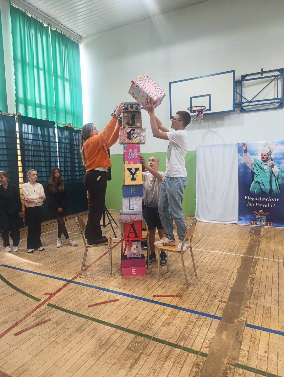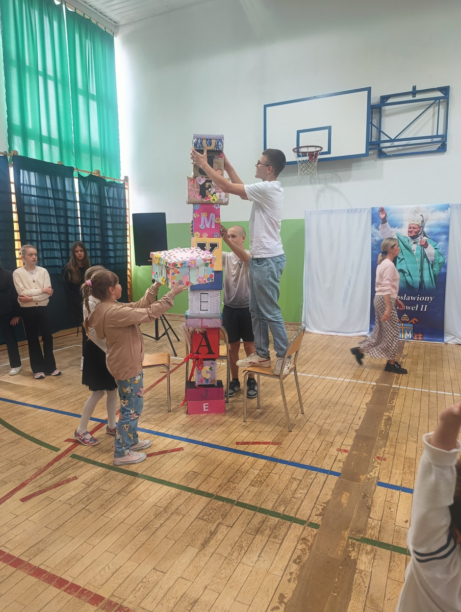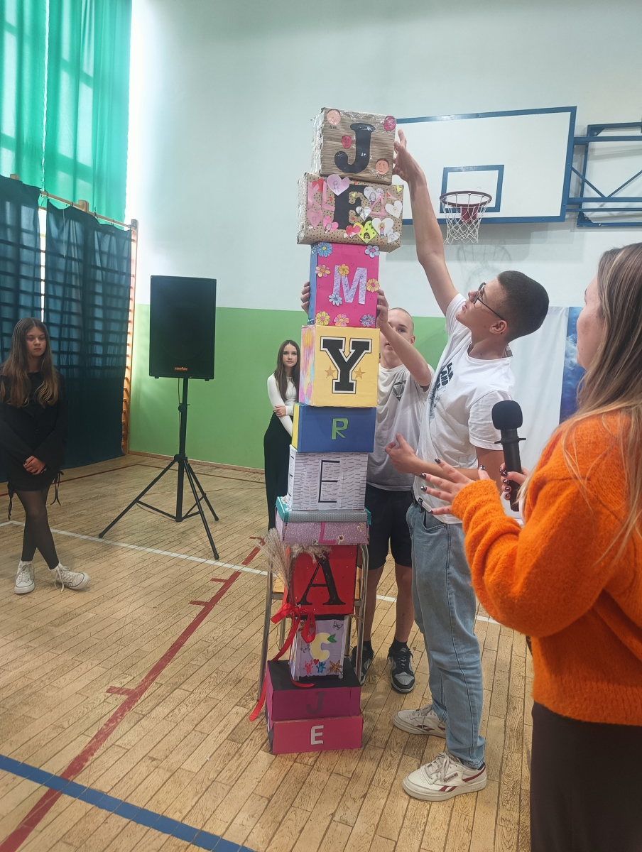 Każda klasa przygotowała i ozdobiła swoje pudełka z literami, które zostały zaprezentowane 16 października 2025r. na sali gimnastycznej. Następnie wspólnie stworzyliśmy Wieżę Relacji – symbol empatii, szacunku i współpracy.
