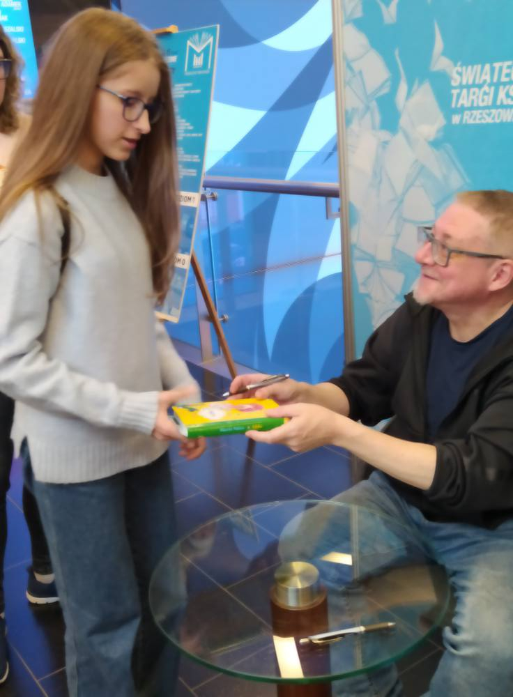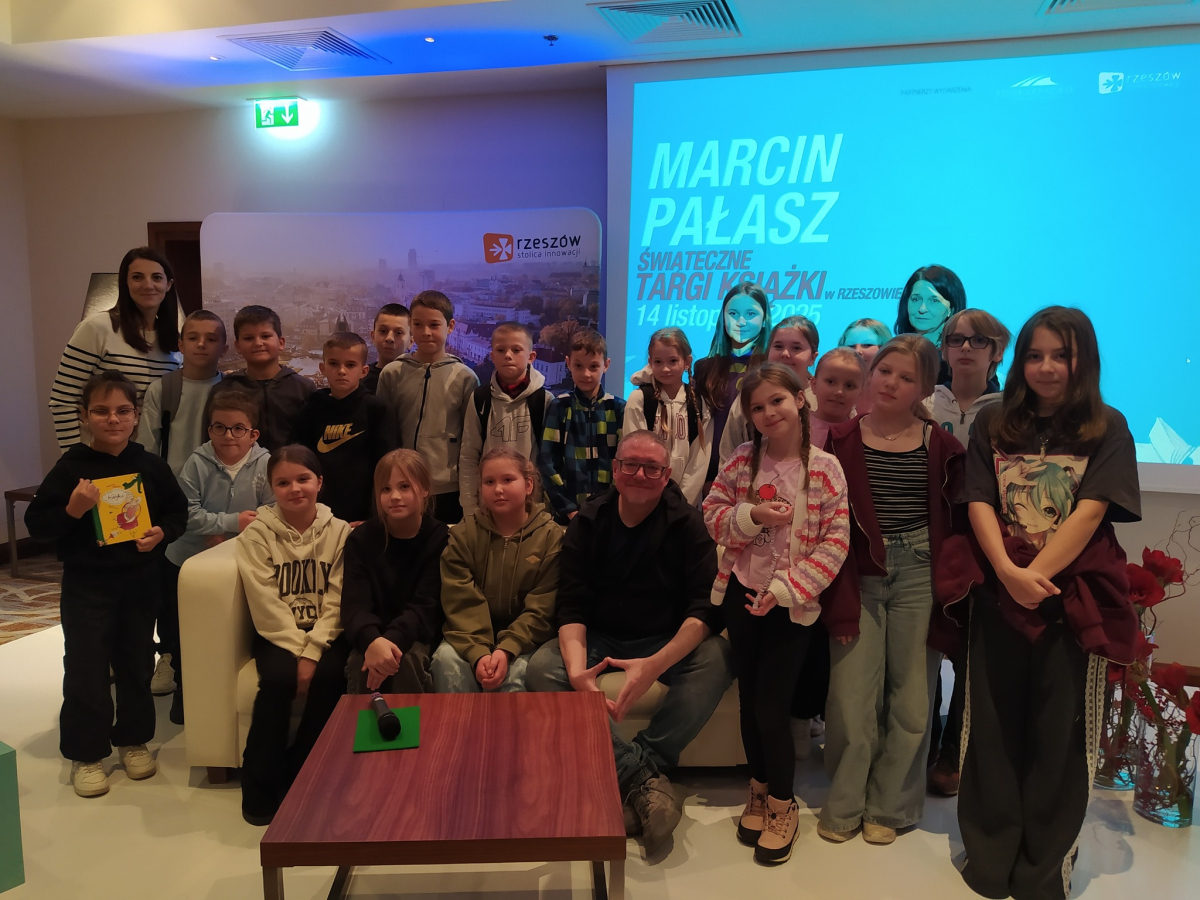 Naszym głównym celem było spotkanie z Marcinem Pałaszem, autorem m.in. książki „Sposób na Elfa”. Pisarz w barwny i pełen humoru sposób opowiedział o swojej pracy, a po spotkaniu uczniowie mieli możliwość osobistej rozmowy, zdobycia autografu oraz wykonania pamiątkowych zdjęć.