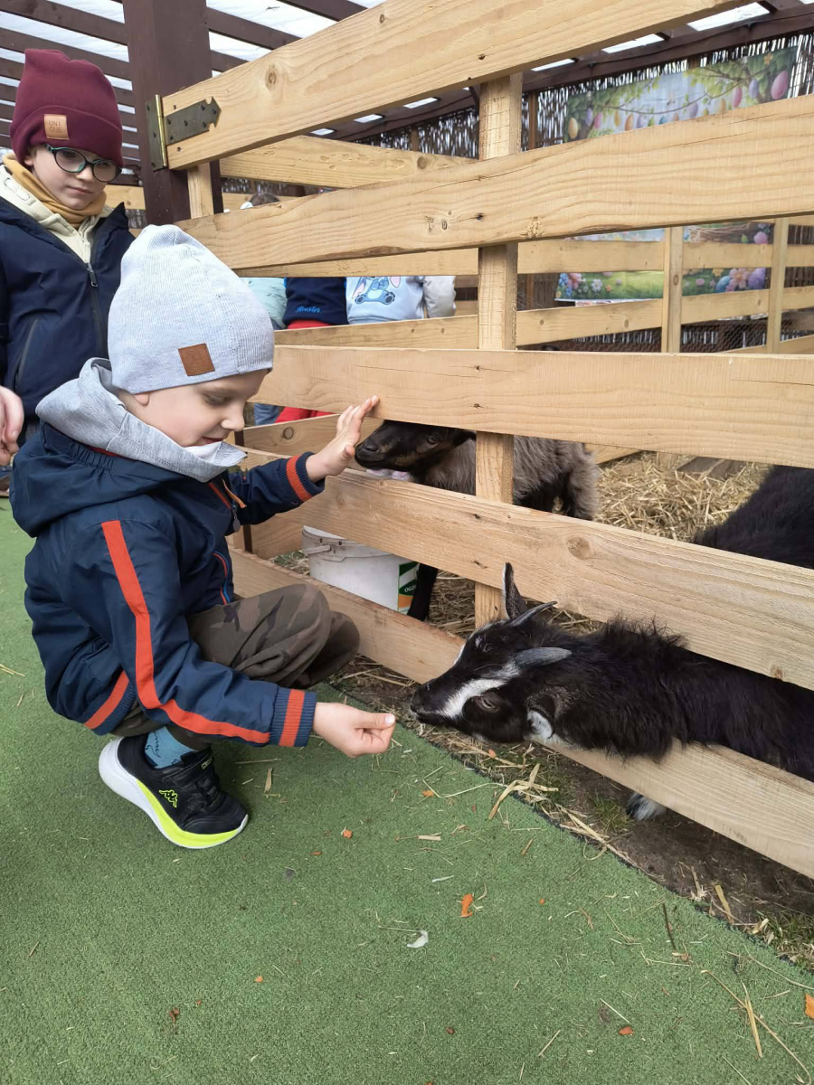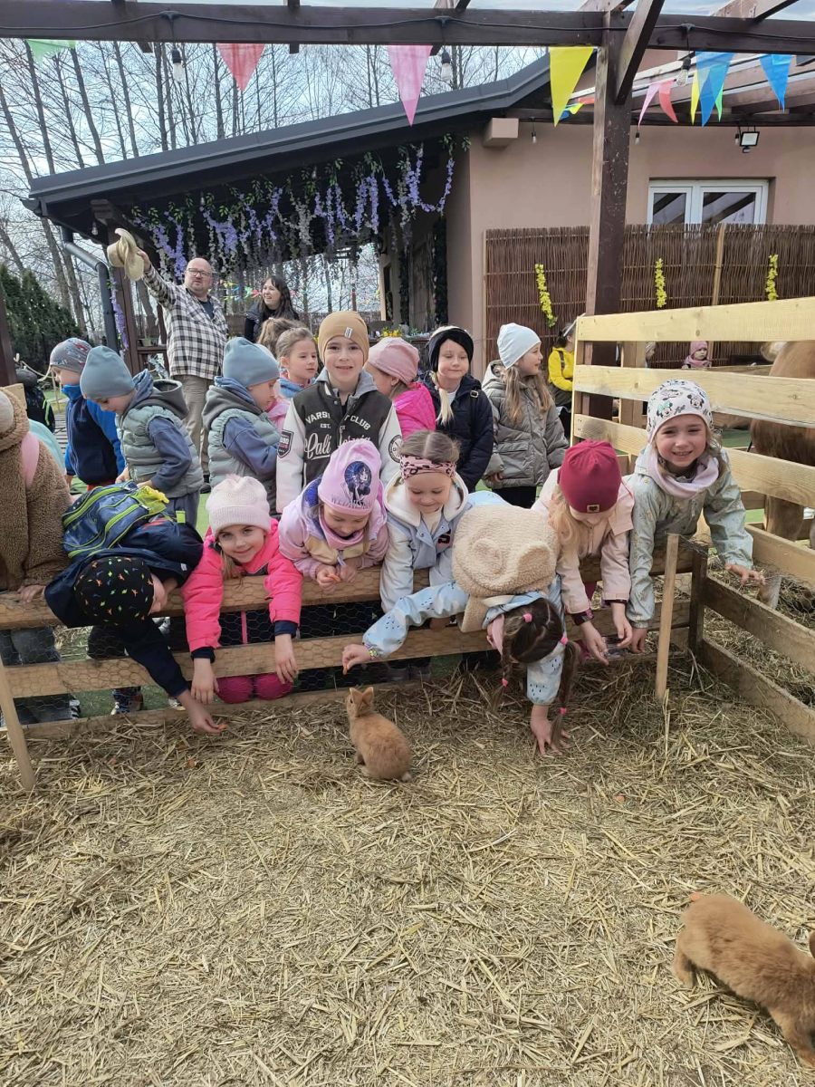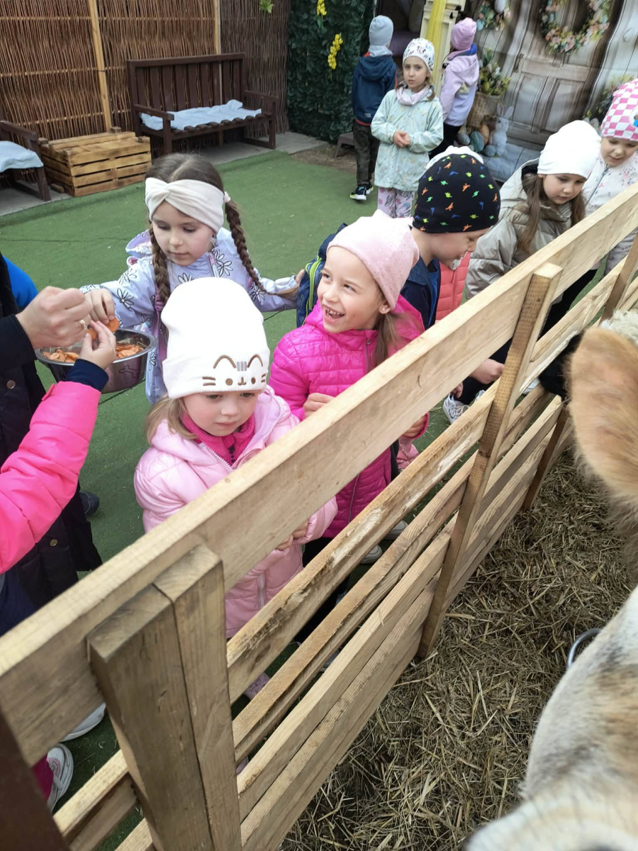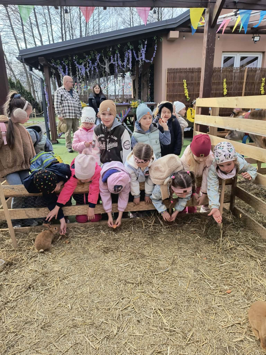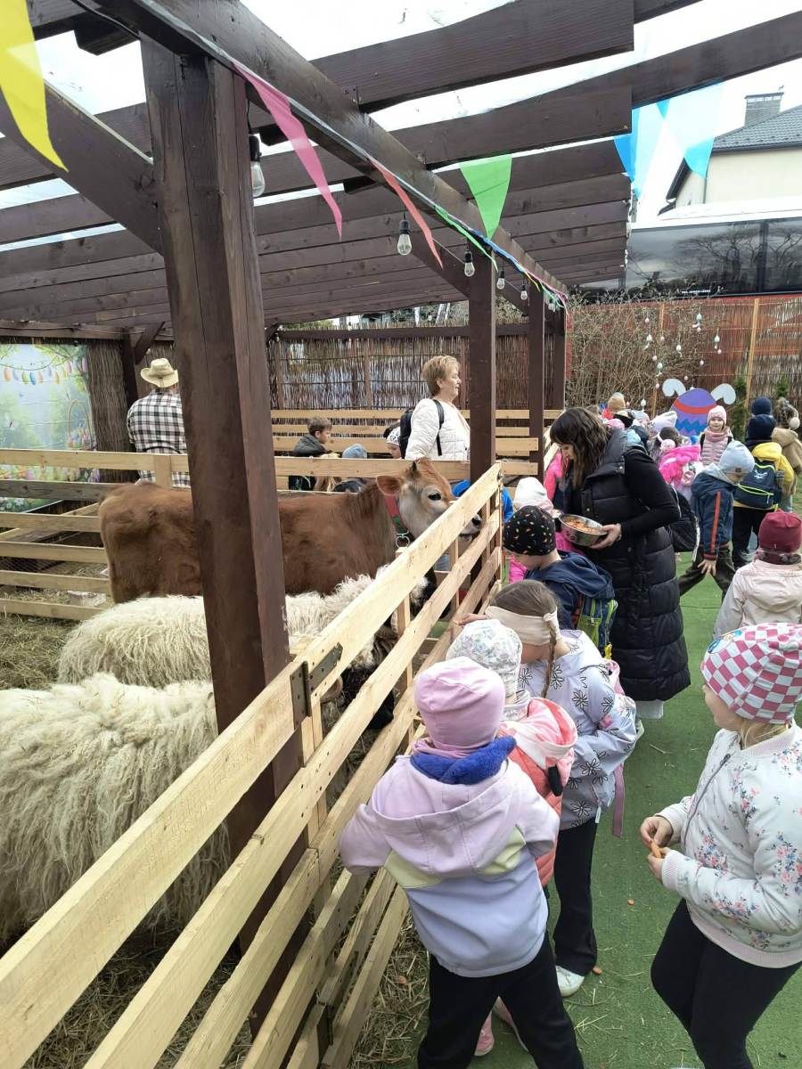 Zwieńczeniem dnia był wyjazd do Wioski Wielkanocnej. Tam przedszkolaki miały okazję zobaczyć zwierzęta gospodarskie, takie jak króliki, kozy, krowę i owce. Największą atrakcją dla dzieci było karmienie zwierząt, które sprawiło im wiele radości i dostarczyło niezapomnianych wrażeń. Dzieci wzięły również udział w warsztatach plastycznych, podczas których malowały króliczki.