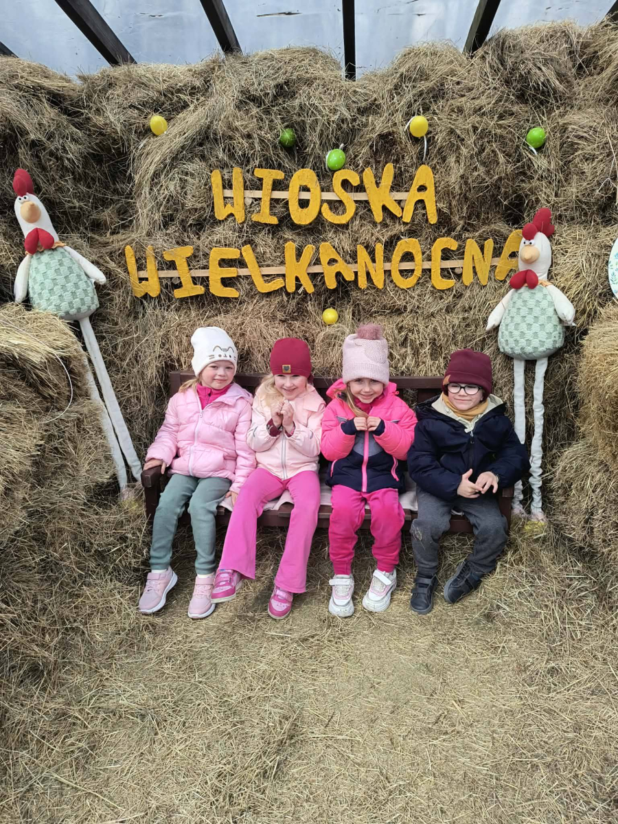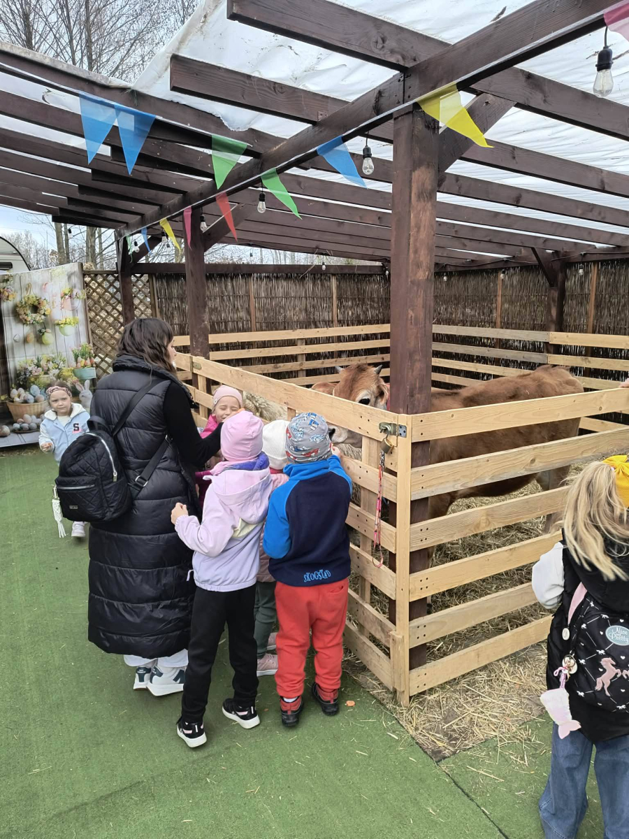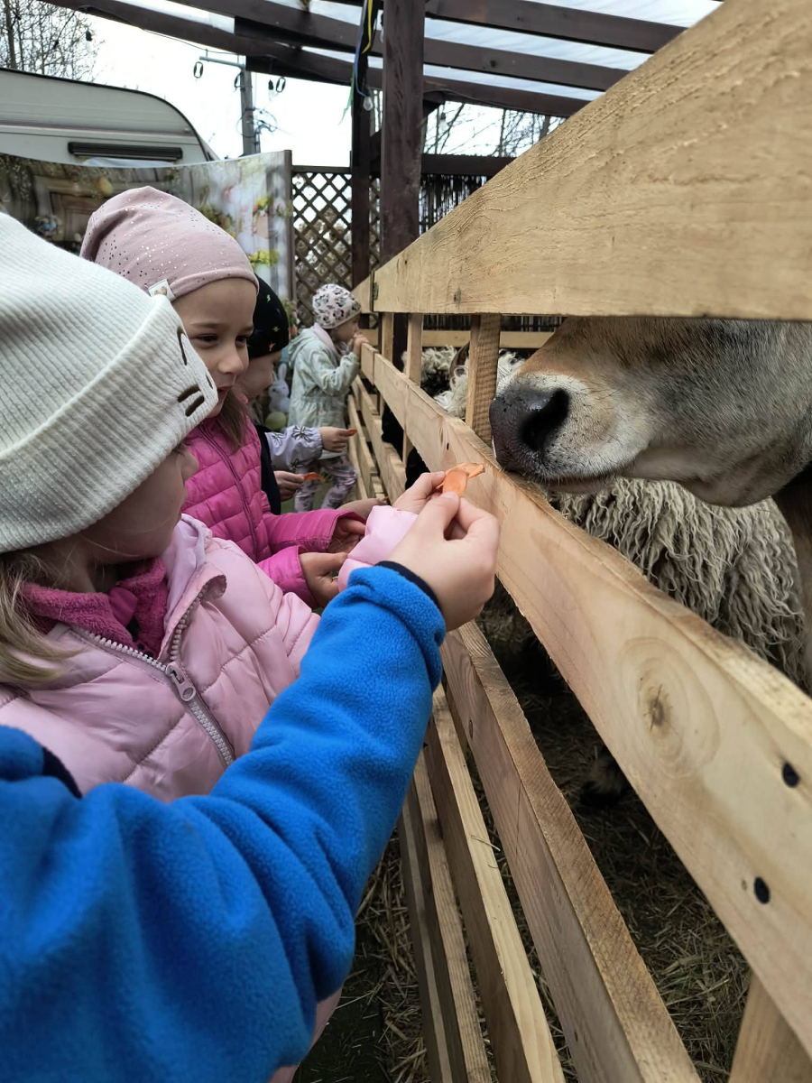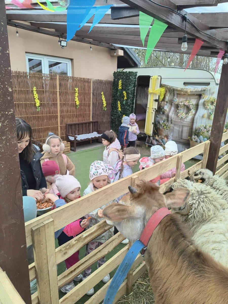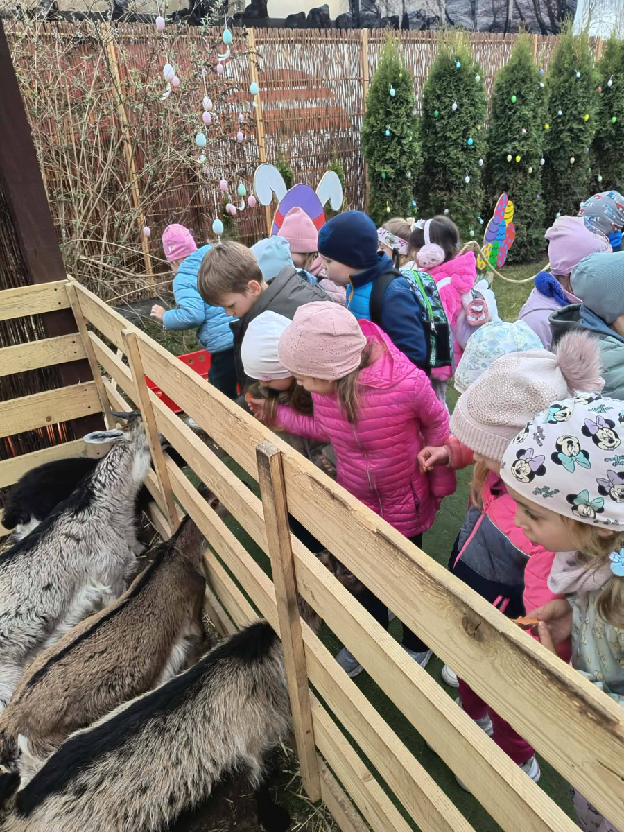 Zwieńczeniem dnia był wyjazd do Wioski Wielkanocnej. Tam przedszkolaki miały okazję zobaczyć zwierzęta gospodarskie, takie jak króliki, kozy, krowę i owce. Największą atrakcją dla dzieci było karmienie zwierząt, które sprawiło im wiele radości i dostarczyło niezapomnianych wrażeń. Dzieci wzięły również udział w warsztatach plastycznych, podczas których malowały króliczki.