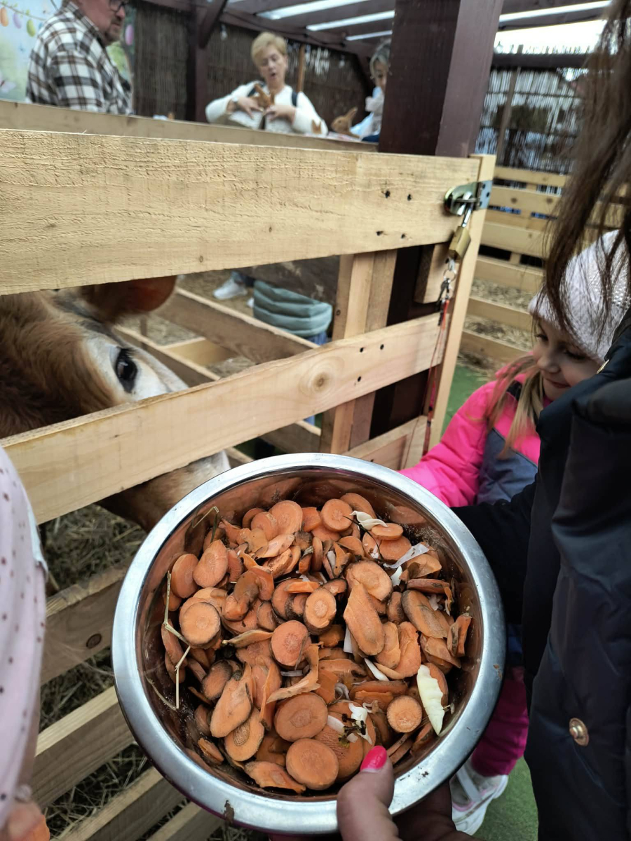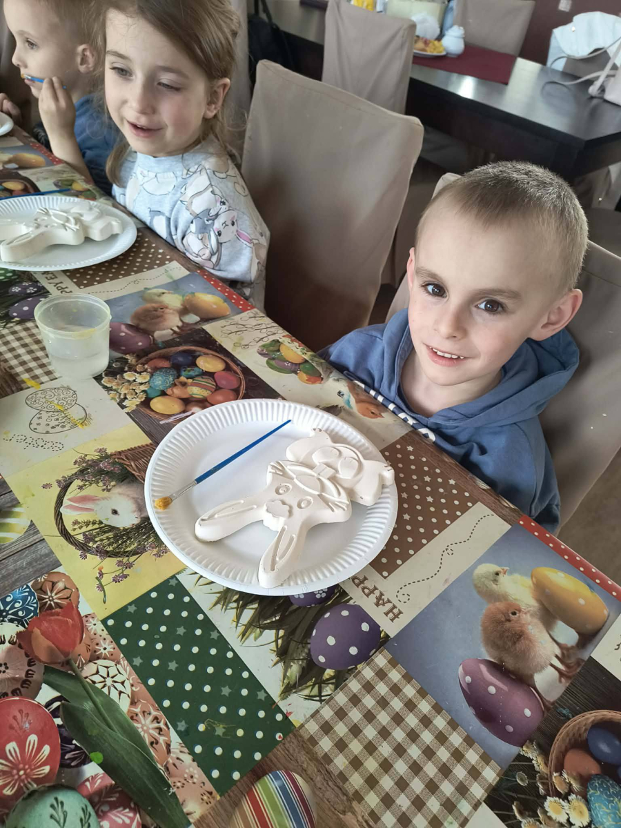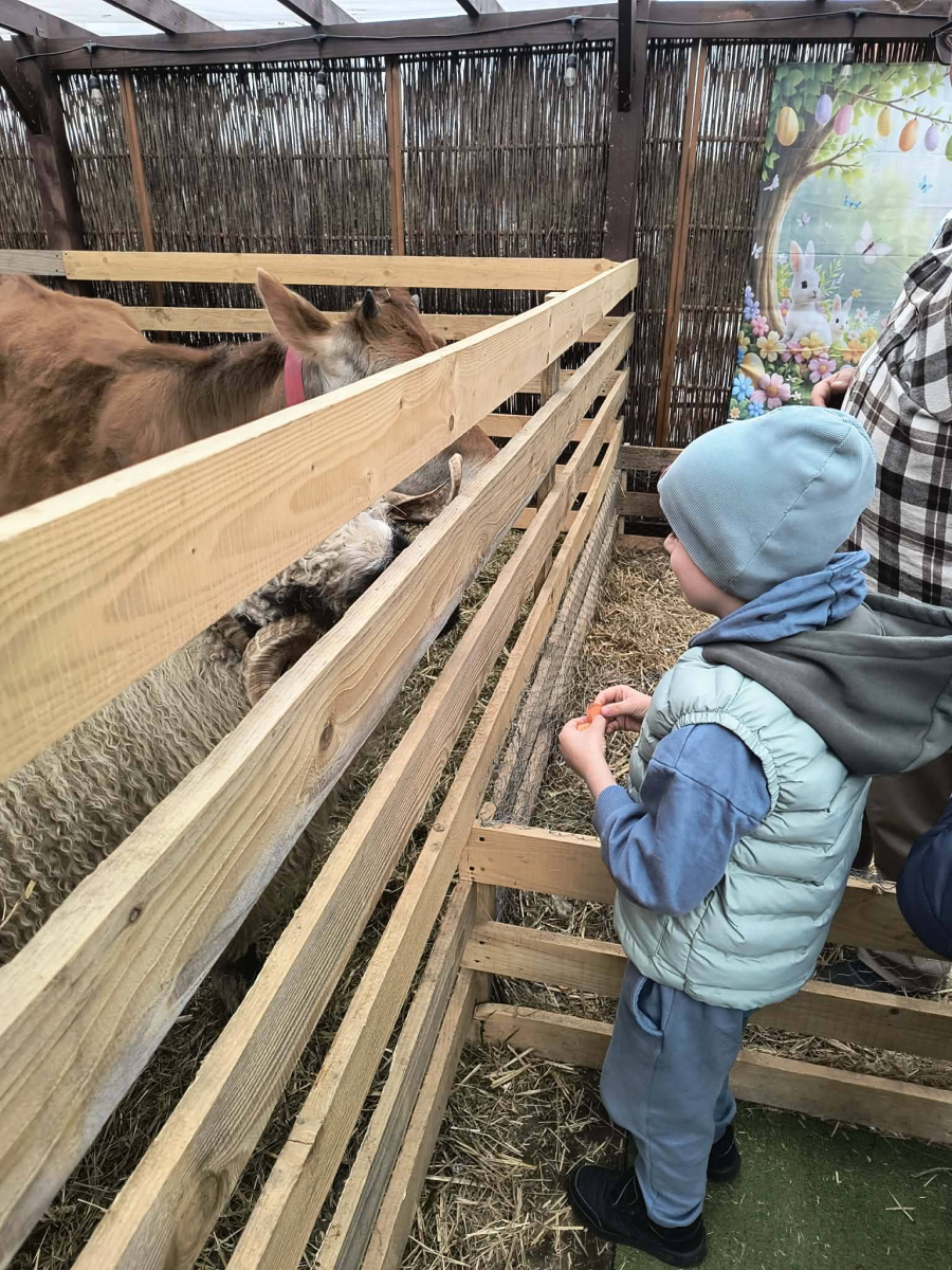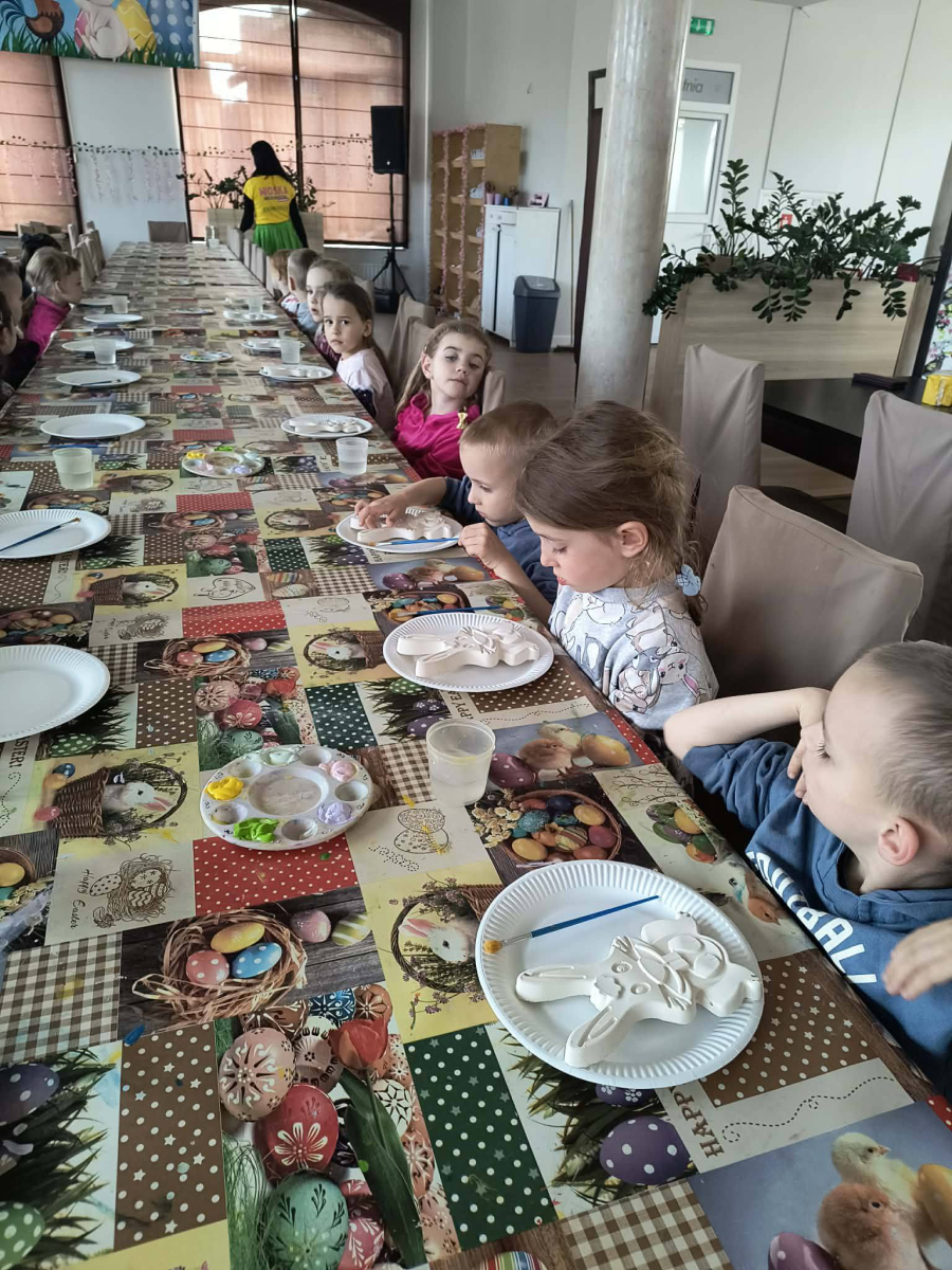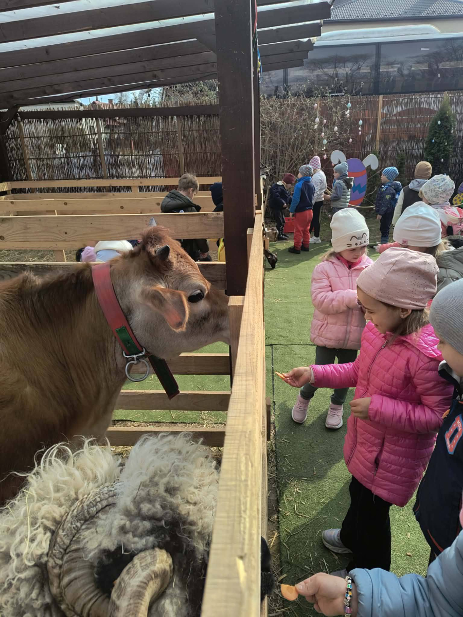 Zwieńczeniem dnia był wyjazd do Wioski Wielkanocnej. Tam przedszkolaki miały okazję zobaczyć zwierzęta gospodarskie, takie jak króliki, kozy, krowę i owce. Największą atrakcją dla dzieci było karmienie zwierząt, które sprawiło im wiele radości i dostarczyło niezapomnianych wrażeń. Dzieci wzięły również udział w warsztatach plastycznych, podczas których malowały króliczki.