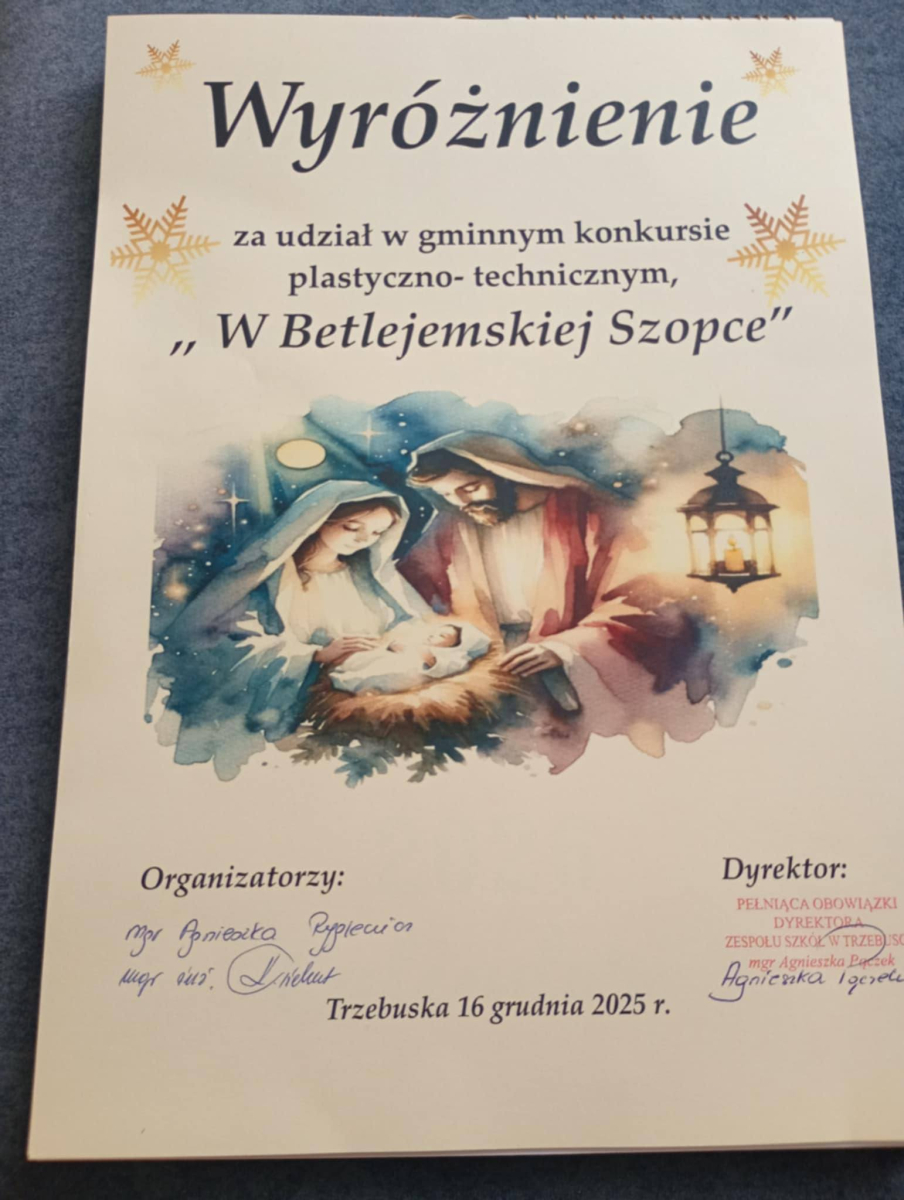 Wyróżnienie w gminnym konkursie plastyczno - technicznym „W Betlejemskiej Szopce” otrzymał Sebastaian Wrzos z klasy 2. Gratulujemy!